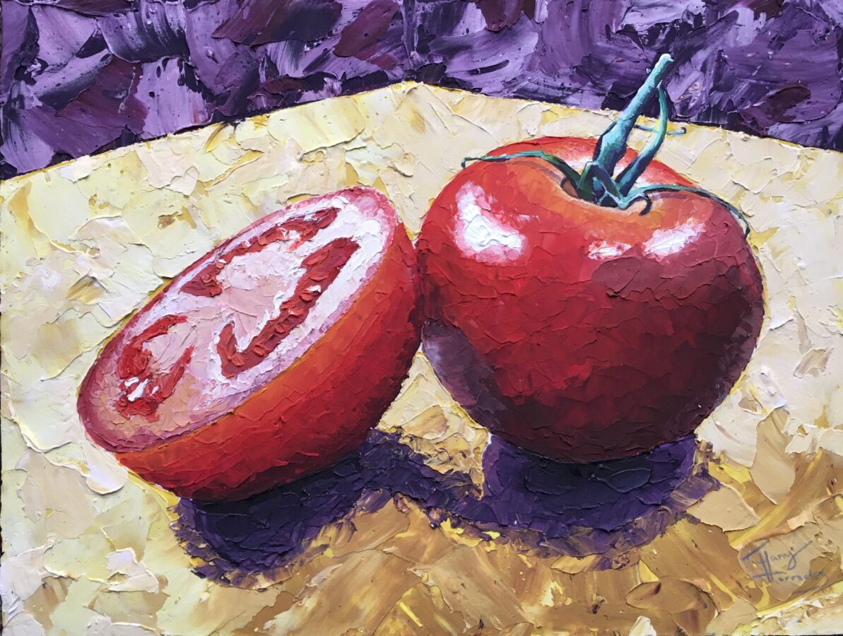 Part of my Kitchen Table Series, this 12” x 16” painting is, for me, all about the capturing the richness and sensuality of a vine ripened tomato. I love exporing all the rich burgundy/ purple tones in the shade colours of these tomatoes.